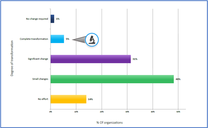 Preparing for and managing change is a fundamental part of business success. Yet, most organizations have not made any major changes to their PBF processes in the last 3 years. And it’s not because change isn’t needed! To understand how transformation impacts the agility of planning, budgeting, and forecasting, the survey compared the 5% of companies that have completely transformed their functions to the 14% that put no effort into it in the last 3 years.